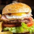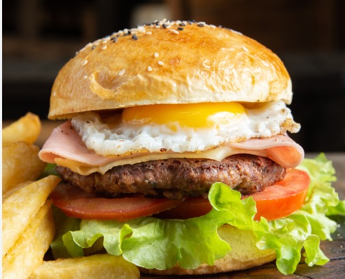 2 Medallones de Carne 130gr c/u Jamon cocido, Queso, Lechuga, Tomate, Huevo a la plancha c/ guarnición Papas fritas.