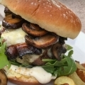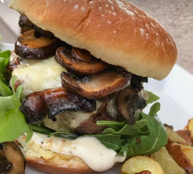 Medallones de x2 carne 130gr c/u Muzzarella, Queso azul, Champigñones, Rúcula y Papas fritas