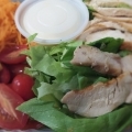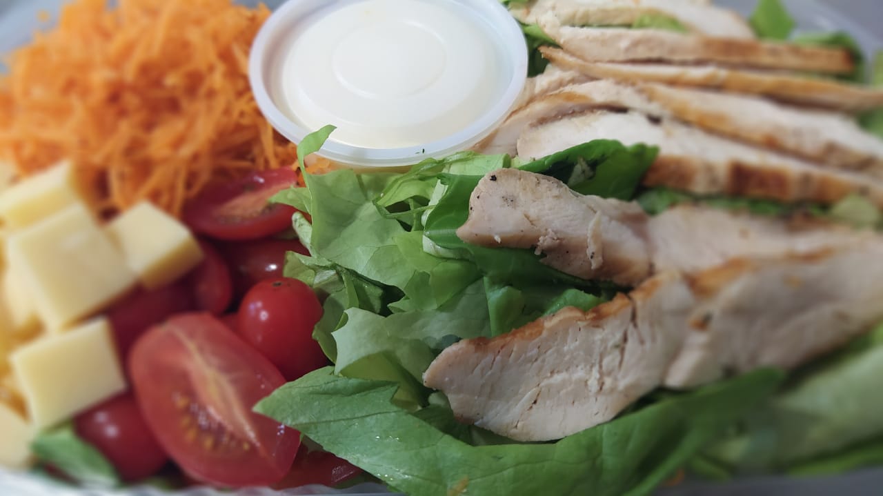 Tomates cherry, zanahoria rallada, queso en cubos, hojas frescas, pollo grille.Aderezo mayonesa, vinagre, sal.