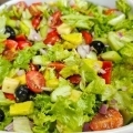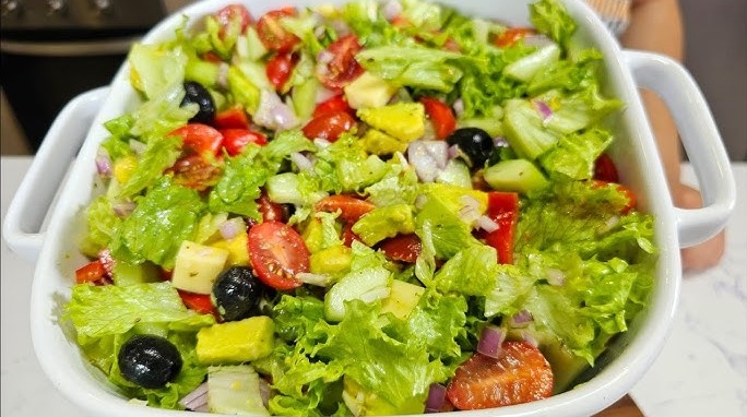 Ensalada hojas verdes, queso, palta, huevo, zanahoria, cherry, y aceitunas