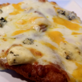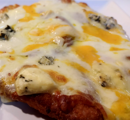 Milanesa de pollo, con salsa, muzzarela, sardo, queso azul y danbo