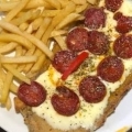 Super Milanesa de pollo con salsa-muzza y salame Calabresa