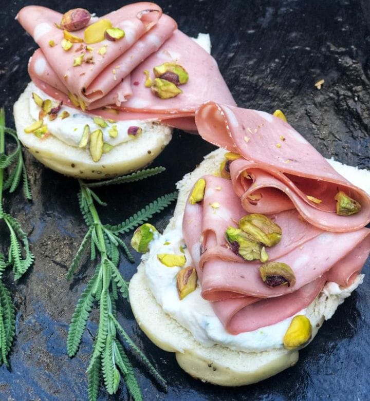 Sandwich de Mortadela c/pistachos, queso y cherrys y guarnición